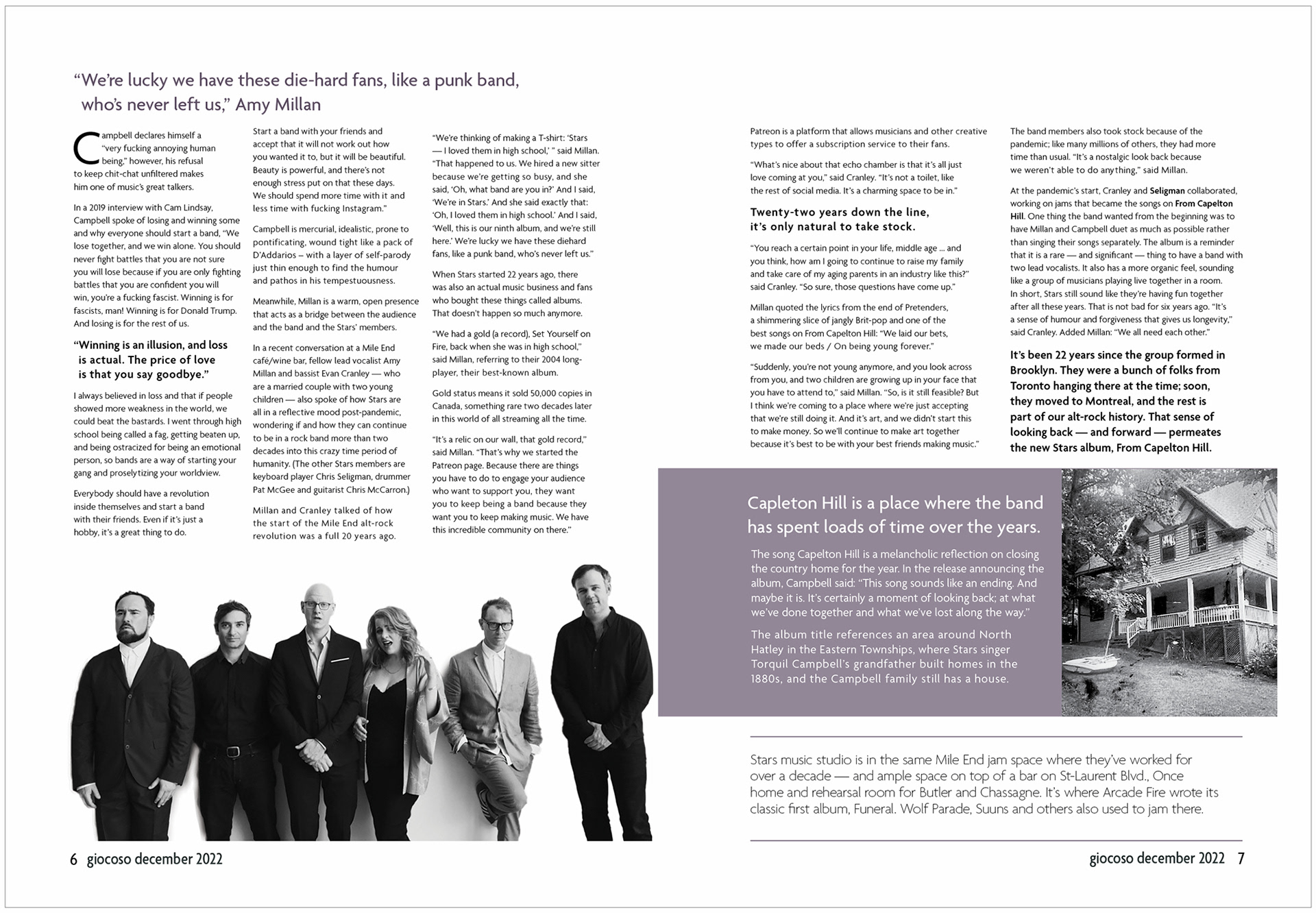 Nameplate, Cover Design, Editorial Layout of Table of Contents, and Double-page Spread for Giocoso, a fictional music magazine featuring the Canadian band Stars. Software: Adobe InDesign, Adobe Photoshop. Adobe Illustrator.